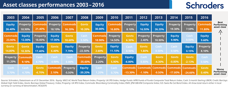 Source: Schroders, Datastream as of 31 December 2016. Equity: MSCI AC World Total Return Index, Property: UK IPD Index, Cash: 3 month Sterling LIBOR, Credit: Barclays Global High Yield Index, Govts: Barclays Global Treasury Index; Property: UK IPD Index; Commods: Bloomberg Commodity Index. For information purposes only. The material is not intended to provide advice of any kind. Information herein is believed to be reliable but Schroders does not warrant its completeness or accuracy.