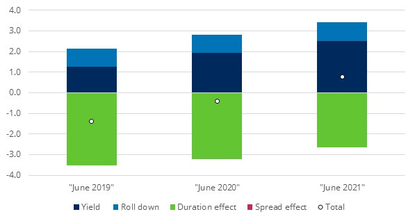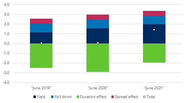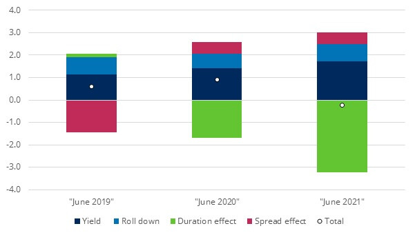 Gradual normalisation (base case) – In this instance, returns are close to zero in the first two years as returns from yield, roll-down and spread narrowing are cancelled out by the duration loss from rising yields. In the third year, the return is positive at 1.4%, buoyed by smaller duration loss and higher yield income. This positive return in the third year is enough to push the three-year annualized return to 0.5%.
