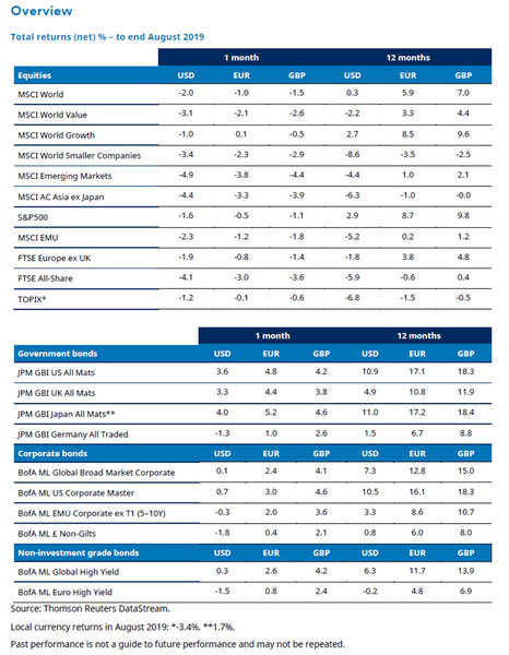 - August saw global stock markets decline while perceived safe haven assets such as bonds outperformed amid escalating worries over trade and growth. A closely-watched US bond market indicator suggested rising recession risk.