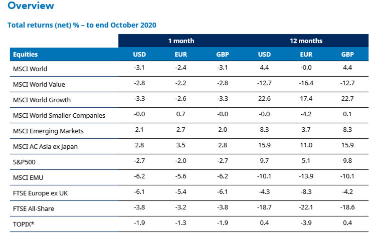 - Global equities declined in October. The US presidential election and rising Covid-19 cases in many countries, notably across Europe, were the main focus for investors. Corporate bonds outperformed government bonds.