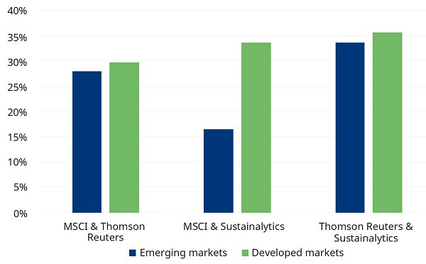 The complexities - described above - of gathering ESG information in EMD analysis make in-house research essential, in our opinion. There is even less consistency between the conclusions drawn by ESG rating agencies, when looking at the same company within emerging markets, than is the case in developed markets. This makes thoughtful analysis particularly impactful in EM.
