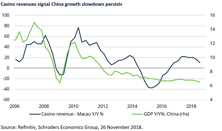 However, the recent slowdown in casino revenues hasn’t shifted immediate growth forecasts. The Schroders Economics Team had already lowered its 2019 growth expectations for China in August. Emerging Markets Economist Craig Botham explains that this was “to incorporate a full-scale escalation of the US-China trade war.”