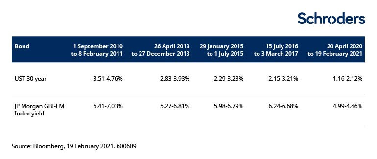 The table below shows each episode. Importantly, EM yields tended not to sell-off to the same degree except when a shift in US policy was unfolding, such as the 2013 Taper Tantrum.