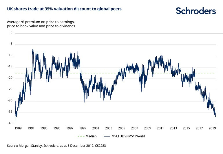 Sue Noffke: “It’s worth noting that the UK has lagged other markets for the last three and a half years. The chart below shows that UK shares typically trade at around a 17% discount to their global peers (the green dotted line on the chart), based on the average of three valuation metrics (see end of article for an explanation of these). That discount recently reached over 35% as of 6 December. There could potentially be scope for this discount to close, given the greater clarity on policy provided by the election result.