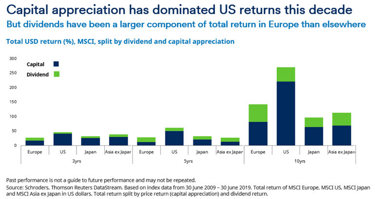 As we can see, the US has enjoyed far greater capital appreciation over the last ten years. However, in Europe, dividends have typically made up a far higher percentage of total return investors receive compared to the other regions.