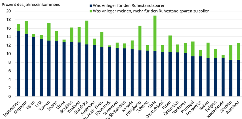 Eine Umfrage unter mehr als 22.000 Investoren in 30 Ländern hat ergeben, dass Anleger auf der ganzen Welt nicht ausreichend fürs Alter vorsorgen. Diejenigen, die den Ruhestand noch vor sich haben, sparen 11,4 Prozent ihres Jahreseinkommens, glauben aber, dass sie 13,7 Prozent auf die Seite legen sollten. Und zwei Drittel (66 Prozent) der bereits im Ruhestand befindlichen Anleger wünschen, sie hätten mehr fürs Alter gespart.