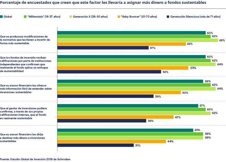 Desde un punto de vista positivo, el Estudio Global de Inversión 2019 de Schroders ha revelado que más de la mitad de los inversores (un 57%) siempre tendrán en cuenta los factores de sustentabilidad a la hora de elegir un producto de inversión —aunque un 17% de ellos no lo hará—. El resto siguen sin estar seguros.