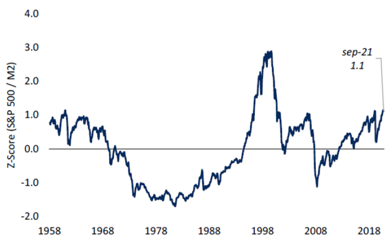 Sin embargo, otras métricas muestran una historia diferente como ser la de evaluar el índice S&P 500 en términos de la liquidez. El ratio S&P 500 sobre M2 se ubica poco más de 1 desvío por encima de la media, sustancialmente por debajo de los 3 desvíos observados previo a la crisis del 2000.