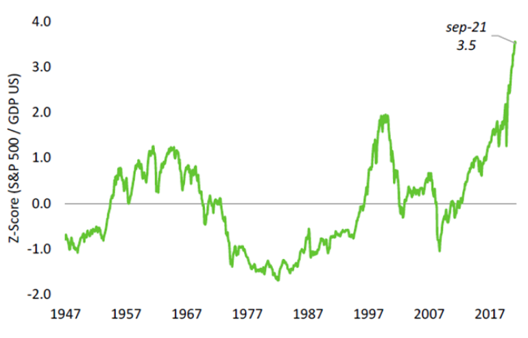 Otra forma de analizar el S&P 500 en términos de valuación es viéndolo relativo al GDP. A los datos de septiembre, medido en Z-Score, el valor era de 3,5, es decir, el ratio del S&P 500 sobre el GDP se ubica 3,5 desvíos por encima del promedio histórico, valor que lo posiciona como el más alto de la historia, sustancialmente superior a los valores previos a la crisis dotcom.