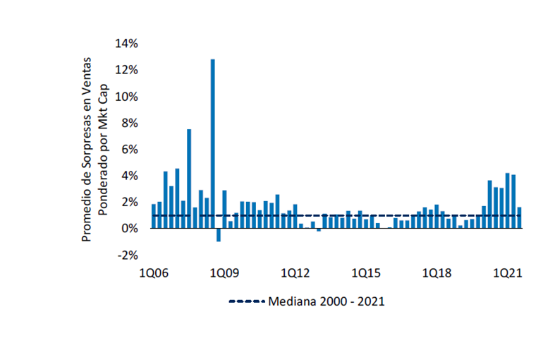 Haciendo el mismo ejercicio, pero ponderando las sorpresas en ventas por market cap, la temporada muestra una mejor faceta: mientras que, en la mediana histórica, el S&P 500 supera a las estimaciones por 1%, la temporada actual arroja un resultado de 1,6% por encima de las proyecciones del mercado.