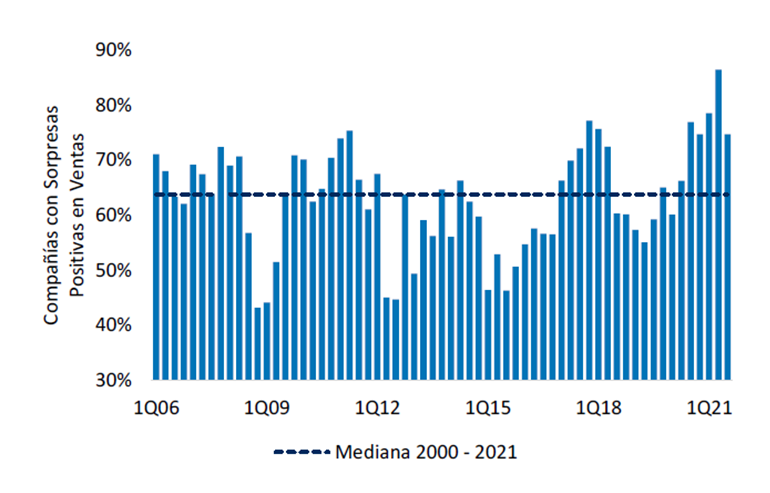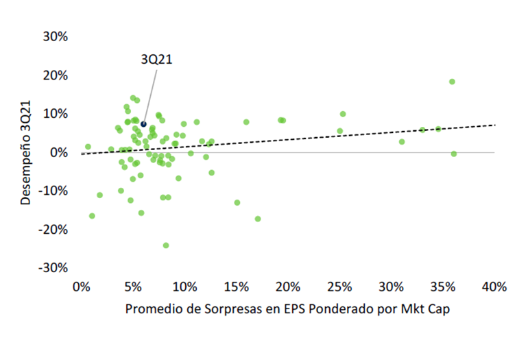 Sin embargo, al ponderar las sorpresas en EPS por la capitalización de mercado de las compañías, la temporada 3Q21 ya no resulta ser tan positiva. En el agregado, el S&P 500 superó en 6% a las estimaciones de EPS, mientras que la mediana histórica se ubica arriba de 7%.