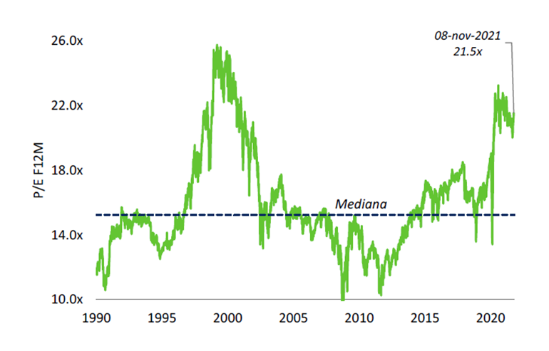 En primer lugar, el S&P 500 cotiza 21,5 veces las ganancias esperadas por acción (EPS) para los próximos 12 meses. Esto se encuentra cómodamente por encima de la mediana de los últimos 30 años (15,2x).