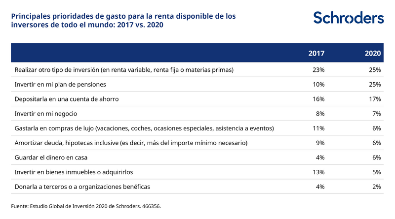 En él, se pone de manifiesto que invertir es una de las principales prioridades de los inversores en lo que respecta al uso de su renta disponible (véase la tabla que aparece a continuación). La situación es muy distinta a hace tan solo tres años, cuando un exiguo 10% de los inversores optaba por invertir en su pensión como primera opción.