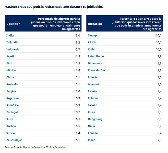 Según el Estudio Global de Inversión 2019 de Schroders, los inversores creen que podrán retirar importantes cantidades de su ahorro para su jubilación sin que se agote.