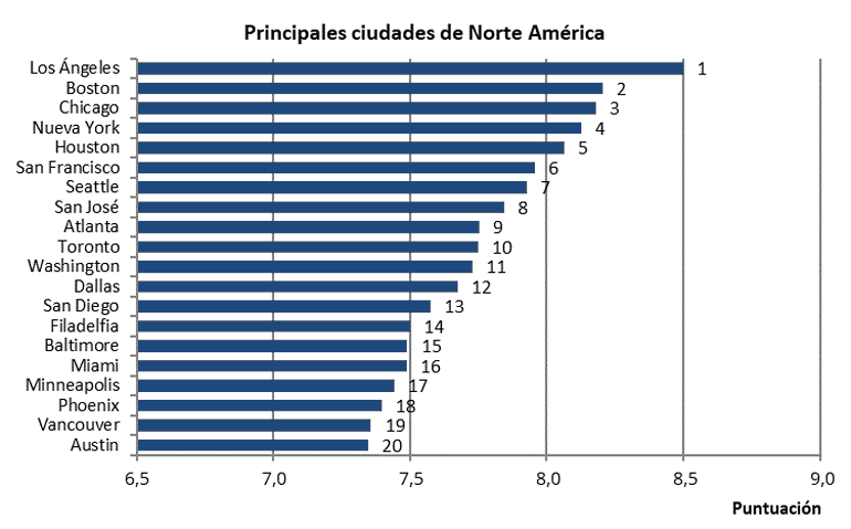 A continuación, se encuentran las 20 principales ciudades en EE. UU. y Canadá clasificadas según su puntuación en el ranking de Ciudades Globales de Schroders –un buen punto de partida para Amazon, ya que la empresa comienza a analizar las respuestas a la RFP a finales de este mes.