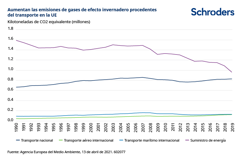 Vemos oportunidades para los inversores a medida que crece la demanda de viajes en tren, se encargan nuevos trenes y se modernizan las flotas existentes. Sin embargo, desde el punto de vista de las emisiones, es necesario abordar los sectores más delicados del transporte aéreo y marítimo.