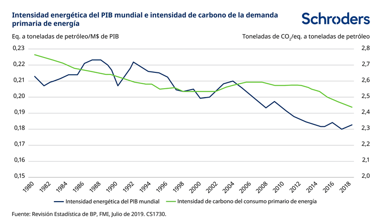 El crecimiento a un ritmo más rápido de lo previsto de las energías renovables y limpias pone de manifiesto la complejidad del cambio climático. La capacidad mundial de producción de energía a partir de fuentes renovables es ahora casi el doble que en 2010, lo que supone, básicamente, un aumento de un tercio de la capacidad neta a lo largo del mismo periodo. Si bien esto ha provocado que la intensidad de carbono de la demanda mundial de energía se haya reducido, este factor positivo se ha visto eclipsado por la lentitud en la mejora de la intensidad energética de la economía mundial.