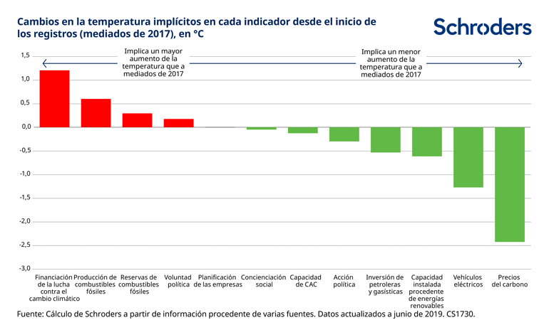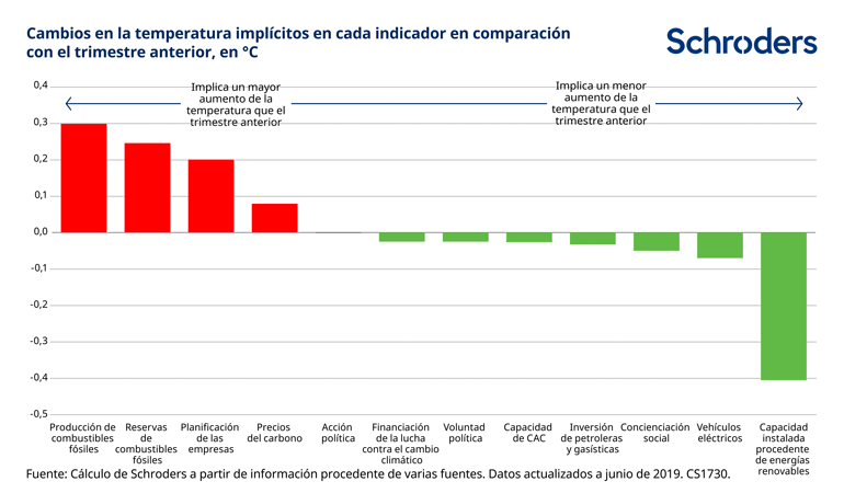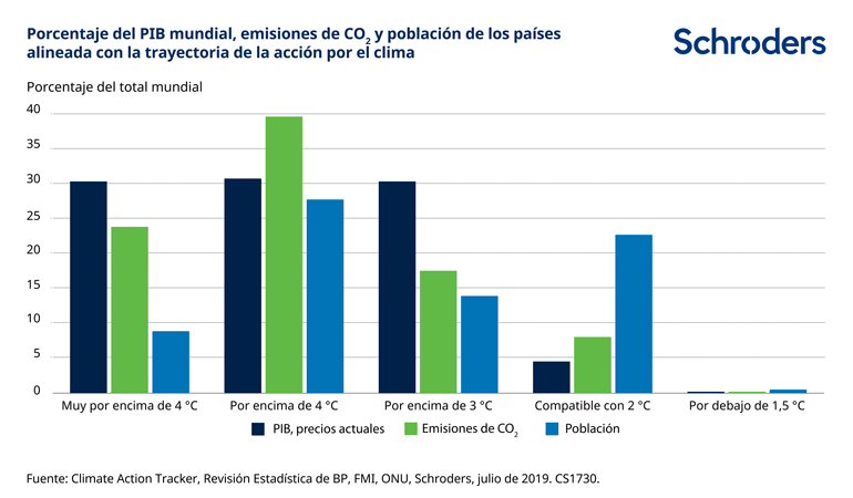 Al comienzo del tercer trimestre de 2019, el Cuadro de mando del cambio climático de Schroders apunta a un aumento de la temperatura a largo plazo de unos 3,8 °C, sin cambios en relación con el trimestre anterior. Con enorme pompa (y provocando un cierto escepticismo), algunas de las principales economías del mundo han aprobado leyes que fijan objetivos de cero emisiones en los últimos meses. Sin embargo, para que se cumplan los compromisos alcanzados en el Acuerdo de París firmado en 2015, todos los países tendrían que seguir su ejemplo.