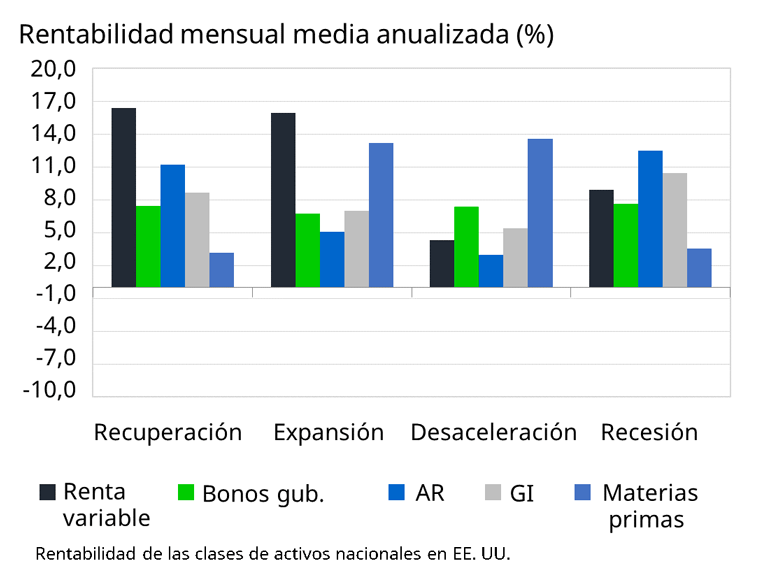 La siguiente tabla muestra la rentabilidad media de la renta variable, los bonos gubernamentales, los bonos de alto rendimiento (AR) y con grado de inversión (GI) y las materias primas en los Estados Unidos a lo largo de las distintas etapas del ciclo desde febrero de 1978.