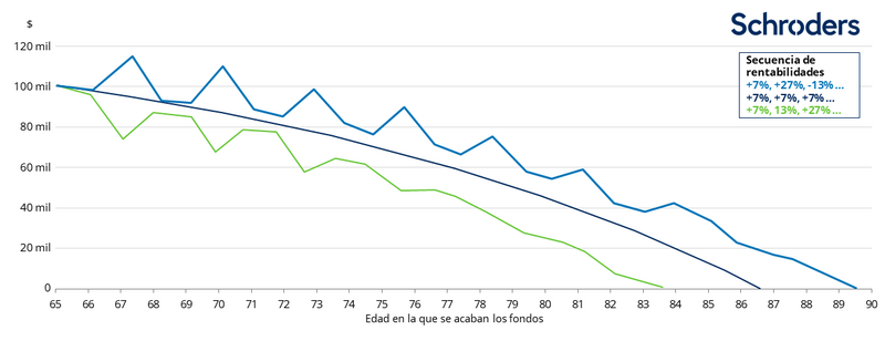 El siguiente gráfico muestra las consecuencias de este proceso. Imagina que tienes 65 años y dispones de una hucha de 100.000 dólares de la que retiras 750 dólares cada mes hasta que no te quede un solo dólar. Para ilustrar este ejemplo, hemos asumido que tu inversión genera una rentabilidad media del 7% anual. No obstante, los mercados rara vez proporcionan rentabilidades de forma sostenida, algunos años son mejores que otros. Cada línea representa una forma diferente de llegar a esa media del 7% durante el período de inversión, tal y como muestra el recuadro de secuencia de rentabilidades.