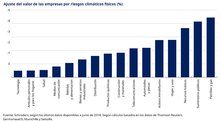Los sectores de petróleo y gas, suministros públicos y recursos básicos son los más expuestos a los efectos físicos del cambio climático. El posible coste de asegurar sus activos físicos representa más del 3% de sus valores de mercado. Los sectores menos expuestos son el tecnológico, el de artículos personales y de uso doméstico y el de salud.