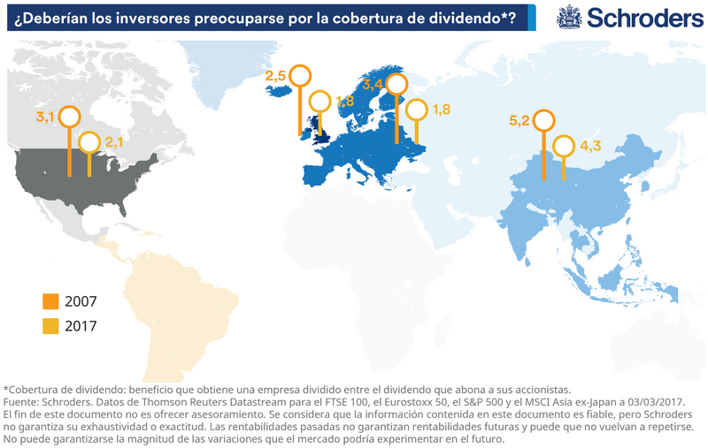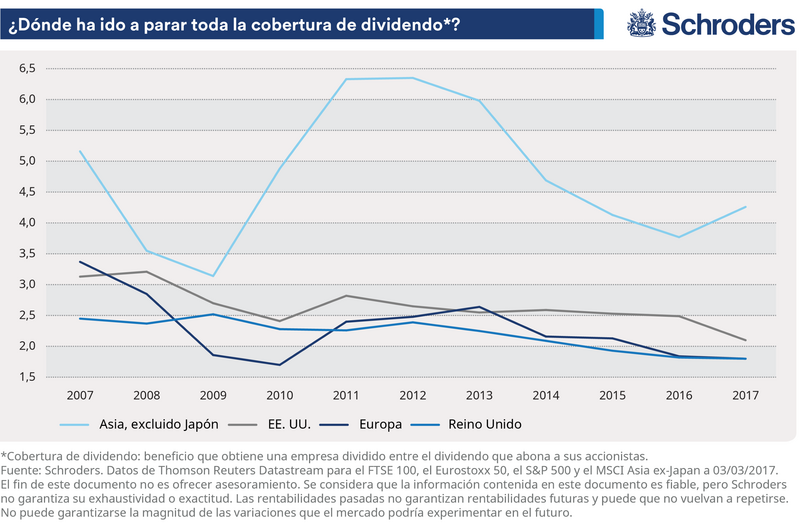 En Europa, la cobertura de dividendo prácticamente se ha reducido a la mitad, hasta 1,8, en la última década. En Estados Unidos, ha retrocedido en un 33%, hasta 2,1; en el Reino Unido, ha descendido en un 26,4%, hasta 1,8. En Asia, la cobertura de dividendo ha caído hasta 4,3, lo cual supone un retroceso del 17,3%.