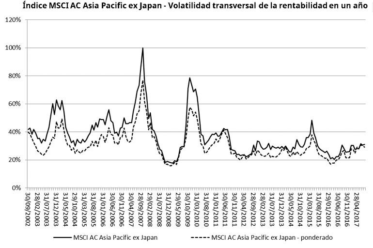 Para ejemplificar el alcance de las enormes variaciones de las valoraciones en el seno de los mercados, podemos fijarnos en la volatilidad transversal (es decir, la dispersión de la rentabilidad de todos los valores incluidos en el índice MSCI Asia ex Japan) de las rentabilidades a un año.