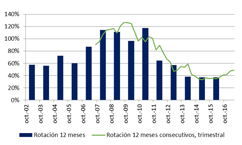 Se trata de una filosofía puesta a prueba durante décadas y desde luego durante los más de 20 años de vida del fondo que gestiono desde hace más tiempo. Aun así, a un observador externo podría sorprenderle la magnitud con la que la rotación ha variado con los años, tal y como se ilustra a continuación.