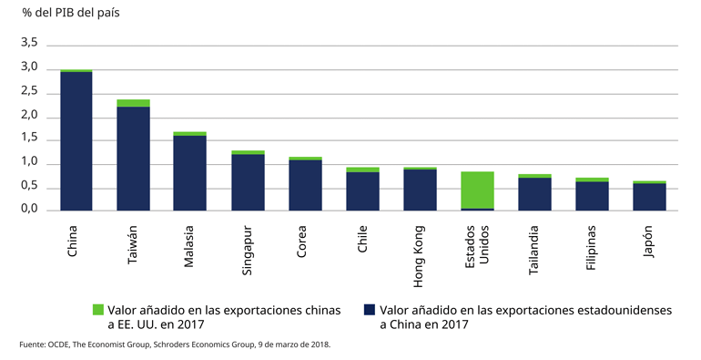 No obstante, no solo China se vería afectada por un aumento de los aranceles. A menudo, aunque un producto pueda ser exportado de China a Estados Unidos, la mayoría de sus componentes se producen en otros lugares. Para el comercio chino, alrededor del 35% del valor añadido en las exportaciones procede de otros países.
