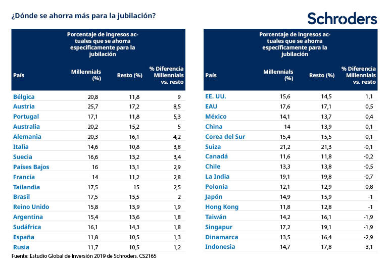 *En abril de 2019, Schroders encargó a Research Plus Ltd la realización de una encuesta independiente a través de internet en la que participaron 25.743 inversores de 32 localizaciones de todo el mundo, entre ellas, Australia, Brasil, Canadá, China, Francia, Alemania, la India, Italia, Japón, Países Bajos, España, Reino Unido y Estados Unidos. Este estudio entiende por «inversores» aquellas personas que invertirán un mínimo de 10.000 euros (o su contravalor en otras divisas) en los próximos 12 meses y que hayan modificado sus inversiones en los últimos diez años.