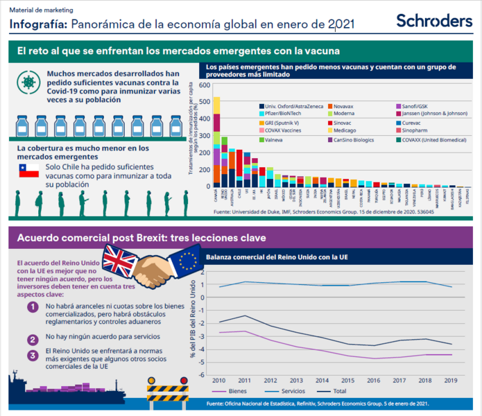 La infografía de este mes analiza el despliegue de vacunas en los mercados emergentes, el acuerdo del Reino Unido sobre el Brexit y la deflación en la eurozona.