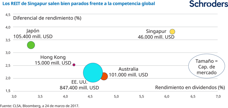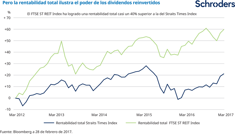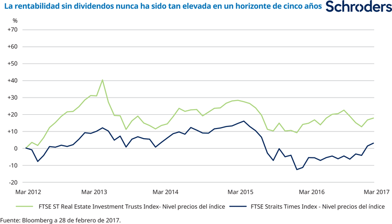 Por ejemplo, el índice de referencia FTSE ST REIT Index (FTSREI) de Singapur ha ganado un 19,7% en cinco años basándose simplemente en la rentabilidad sin dividendos frente a la ganancia del 3,2% del Straits Times Index, de carácter más general.