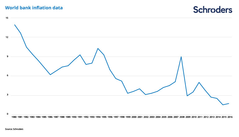 La inflación a escala global ha permanecido en niveles reducidos durante los últimos años en comparación con su trayectoria histórica. En la década de 1980, se situaba nada menos que en un 14%, mientras que en la de 1990 superaba ligeramente el umbral del 10%, según datos del Banco Mundial. Durante las dos últimas décadas, la inflación se ha mantenido, por lo general, en torno al 4%, exceptuando un breve periodo antes de la crisis financiera global. Dado que la economía mundial todavía no se ha recuperado por completo, los precios se han visto poco presionados y la inflación marcó un mínimo de 1,5% en 2015.