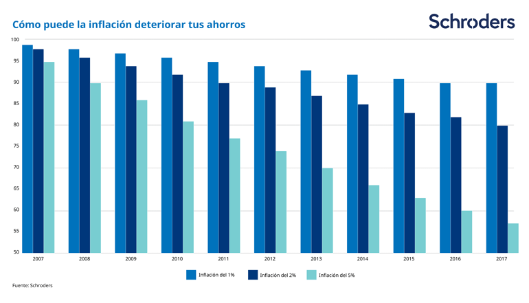 Lógicamente, el deterioro del patrimonio puede mitigarse. Colocar el dinero en una cuenta de ahorros generará intereses, mientras que invertirlo brinda la posibilidad de ofrecer mejores rentabilidades, si bien conlleva la exposición a un cierto riesgo.