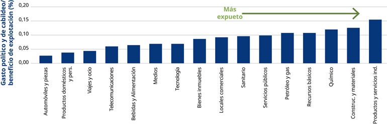 El capital político puede convertirse más en una carga ya que crece el escepticismo del sector corporativo, las opiniones políticas de los consumidores son más dispares y el liderazgo político resulta más flexible. Aunque los gastos de lobby suelen suponer una pequeña proporción de los beneficios, algunos sectores y empresas han establecido relaciones sólidas y han influido en políticas a su favor. En el futuro, los impulsos obtenidos gracias a estos esfuerzos pueden convertirse en problemas. El siguiente gráfico muestra los niveles medios del gasto de lobby y de aportaciones políticas de cada sector.