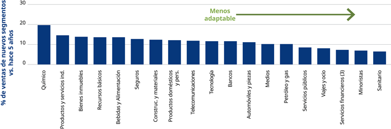 Para evaluar la capacidad de adaptación corporativa, el siguiente gráfico compara las proporciones de ventas que las empresas generan con segmentos de productos que existían en su negocio hace cinco años. De media, las empresas en todos los sectores generan más de tres cuartas partes de sus ventas a partir de unidades de negocio bien establecidas, aunque hay diferencias considerables entre sectores.