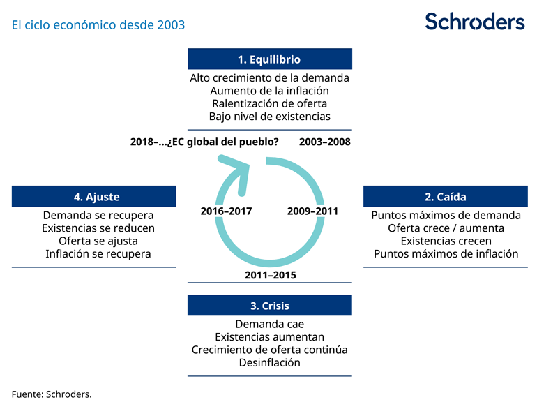 Las materias primas continúan firmemente estancadas en una situación “anticuada” en el ciclo de confianza, caracterizadas por un posicionamiento del inversor infraponderado y cierres del fondo. Pocos inversores tienen una cobertura adecuada contra la inflación en sus carteras. En nuestra opinión, con la perspectiva del mercado mejorada descrita a continuación, es el momento de reconsiderar la exposición a esas clases de activos favorables a la inflación como las materias primas.