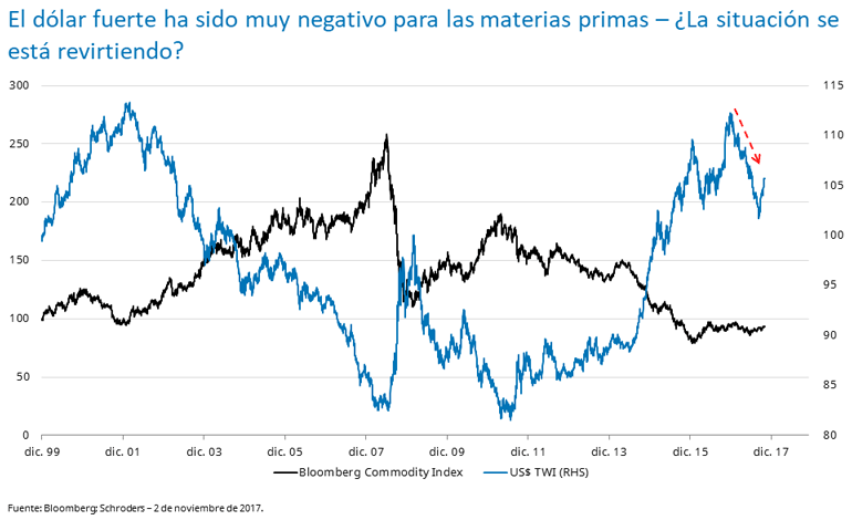 Un dólar estadounidense fuerte fue muy negativo para las materias primas en el mercado bajista que finalizó a principios de 2016. Es probable que la depreciación del dólar de 2017 marque el inicio de un nuevo mercado a la baja de esta divisa. ¿Qué podría impulsar esto? Varios factores. Un incremento en el presupuesto nacional de EE. UU. y los déficits comerciales extranjeros, impulsados por los recortes fiscales y un elevado gasto militar y en programas sociales, que históricamente se corresponden razonablemente bien con períodos de debilidad del dólar. Una mayor disfunción política e incluso cuestiones sobre la capacidad de pago de la carga de deuda estadounidense se encuentran también en el horizonte. Un dólar estadounidense débil en 2018 probablemente apoyaría en general a la clase de activos de materias primas.