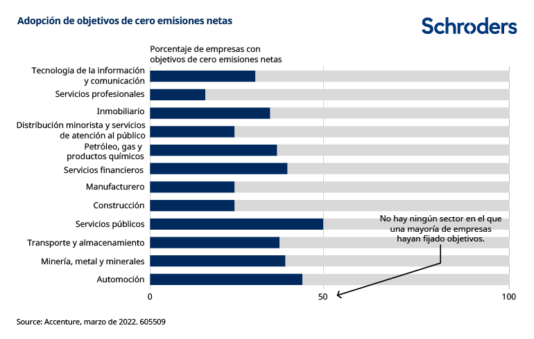 No obstante, tal y como muestra el siguiente gráfico, no hay ningún sector en el que la mayoría de empresas hayan adoptado objetivos de cero emisiones netas. Las cero emisiones netas suponen reducir las emisiones de gases lo máximo posible. Para que el calentamiento global se mantenga por debajo de los 1,5°C, que es el compromiso del Acuerdo de París, habría que reducir las emisiones un 45% para 2030 y lograr las cero emisiones netas para 2050.