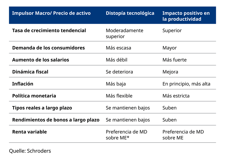 Sin embargo, reconocemos que es difícil llegar a una conclusión definitiva. Dadas las enormes incertidumbres, preferimos considerar una variedad de posibles resultados entre dos extremos: la “distopía tecnológica”, en la que prevalecen un elevado desempleo y una desigualdad cada vez mayor, y el “impacto positivo en la productividad”, donde la automatización facilita un gran incremento en la productividad ampliamente distribuido.
