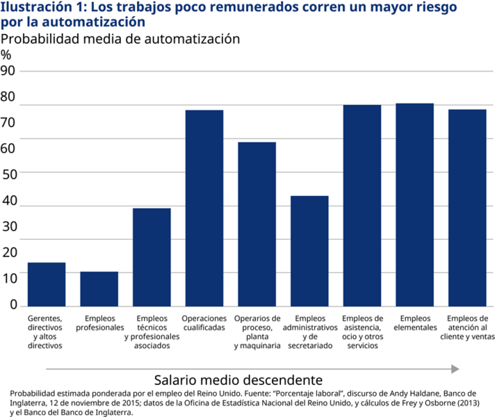 Los efectos hasta el momento Muchos afirmarían que los efectos negativos de la automatización ya son evidentes en EE. UU., donde en las últimas décadas se ha observado un descenso del empleo industrial, motivado por la tecnología y la globalización. Actualmente, la automatización también avanza rápidamente tanto en las funciones de servicios de baja cualificación como en áreas que tradicionalmente han estado dominadas por trabajadores administrativos altamente cualificados (tal como destacan los ejemplos de Reuters e IBM). La mayor desigualdad podría disminuir la demanda de los consumidores, presionar a las finanzas gubernamentales e incluso precipitar un bandazo aún mayor hacia el populismo en el mundo desarrollado.