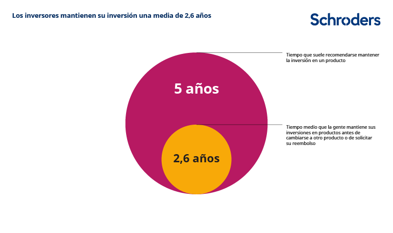 Fuente: Estudio Global de Inversión 2019 de Schroders: Excluyendo las inversiones inmobiliarias o en fondos de pensión, de media, una vez que has puesto dinero en un producto de inversión, ¿cuánto tiempo lo mantienes (antes de cambiar de producto o reembolsarlo)?