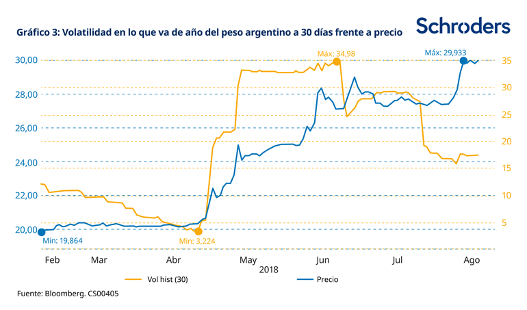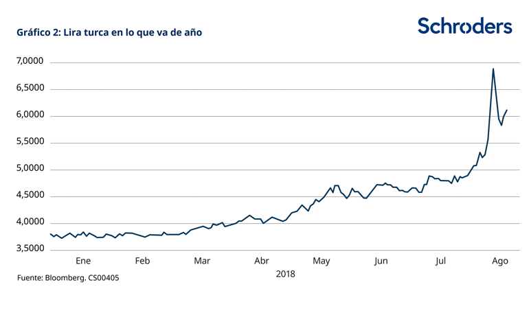 Los bonos turcos denominados en dólares han cedido más de un 15% y la lira turca ha caído más de un 25% en lo que va de año. Entretanto, la deuda argentina denominada en dólares ha registrado un descenso de más del 16% y el peso argentino, del 33%.