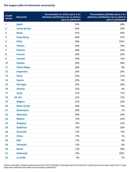 Corea del Sur, Rusia y Hong Kong también están entre las localizaciones donde mayor preocupación hay por el ahorro para la jubilación, tal y como muestra la tabla que aparece más adelante.