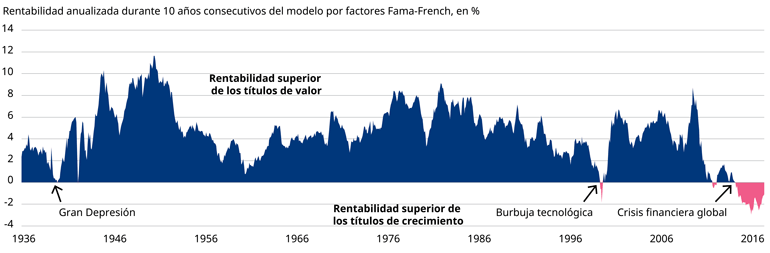 Probablemente, no. Para empezar, parece tratarse de una tendencia anómala. Un parámetro de rentabilidad desarrollado por dos prominentes académicos, Eugene Fama y Kenneth French (véase gráfico), sugiere que solo se han producido tres grandes períodos de rentabilidades inferiores para los títulos de valor en los últimos 90 años: la Gran Depresión de la década de 1930, la burbuja tecnológica de la década de 1990 y el período posterior a la crisis financiera global de los últimos diez años. No obstante, la duración y el alcance del episodio más reciente es el más extremo del que se tiene constancia.
