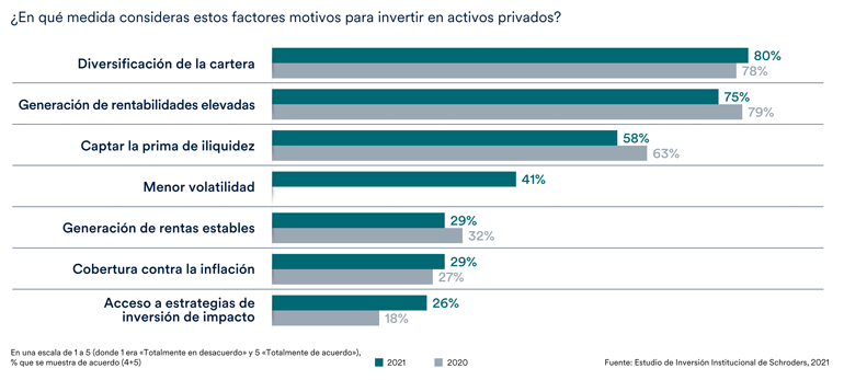 El estudio de este año destaca que la oportunidad de diversificar mejor las carteras es uno de los principales catalizadores del aumento de las asignaciones a los activos privados (con un 80%, lo que supone un aumento frente al 78% de 2020). Así, incluso la opción «generación de rentabilidades elevadas» quedó relegada al segundo lugar en lo que respecta a los motivos por los que los inversores institucionales asignan su capital a los activos privados.