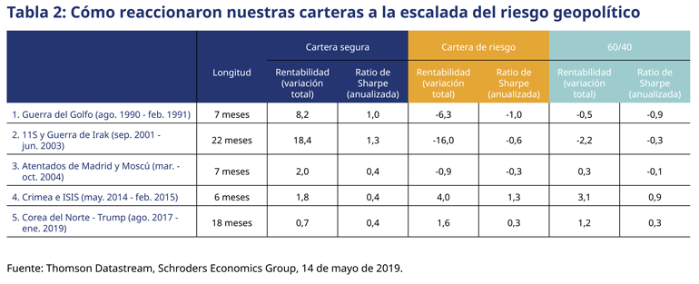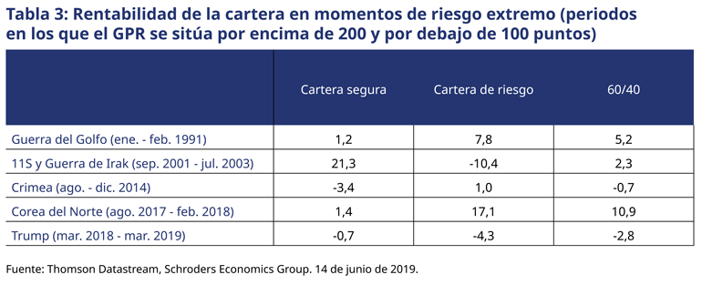 Somos conscientes de que nuestro estudio se basa en una muestra relativamente pequeña de cinco periodos que con poca probabilidad volverán a repetirse exactamente de la misma forma. Sin embargo, hemos llegado a la conclusión de que el riesgo geopolítico no se debe pasar por alto, porque el rendimiento de las carteras mejora si se rota hacia activos refugio cuando el GRP sube.