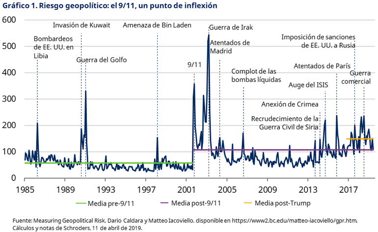 Una forma de medirlo es el Índice de Riesgo Geopolítico (GPR), creado por economistas de la Reserva Federal (Fed). Este índice refleja los resultados de la búsqueda automatizada en el archivo electrónico de 11 periódicos nacionales e internacionales. Contabiliza el número de veces que aparecen palabras clave como “tensión militar”, “guerra” o “amenaza terrorista”.