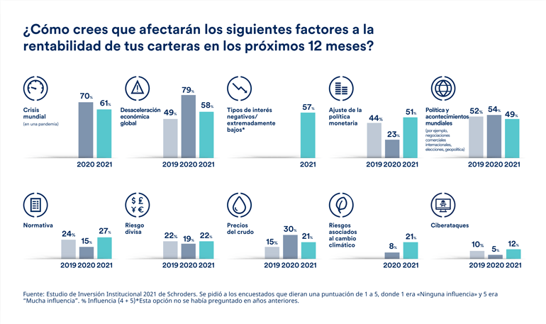 Keith Wade comentó: «Se considera que la pandemia sigue siendo el factor que más influye en la rentabilidad de las carteras, pero ha disminuido considerablemente en comparación con hace un año, junto con el efecto de la desaceleración económica global. La mejora de las perspectivas de crecimiento global está influyendo claramente en esto y los inversores empiezan a preocuparse por una retirada de la liquidez a través de un ajuste de la política monetaria. En general, sin embargo, los tipos de interés negativos o extremadamente bajos se consideran una influencia muy significativa en las carteras».