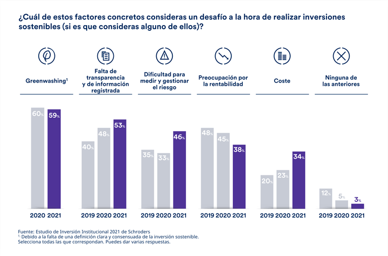 Por segundo año consecutivo, el greenwashingse cita como el problema más difícil al que se enfrentan los inversores. Casi seis de cada diez inversores de todo el mundo están preocupados por esto debido a la falta de definiciones claras y consensuadas sobre lo que es la inversión sostenible.